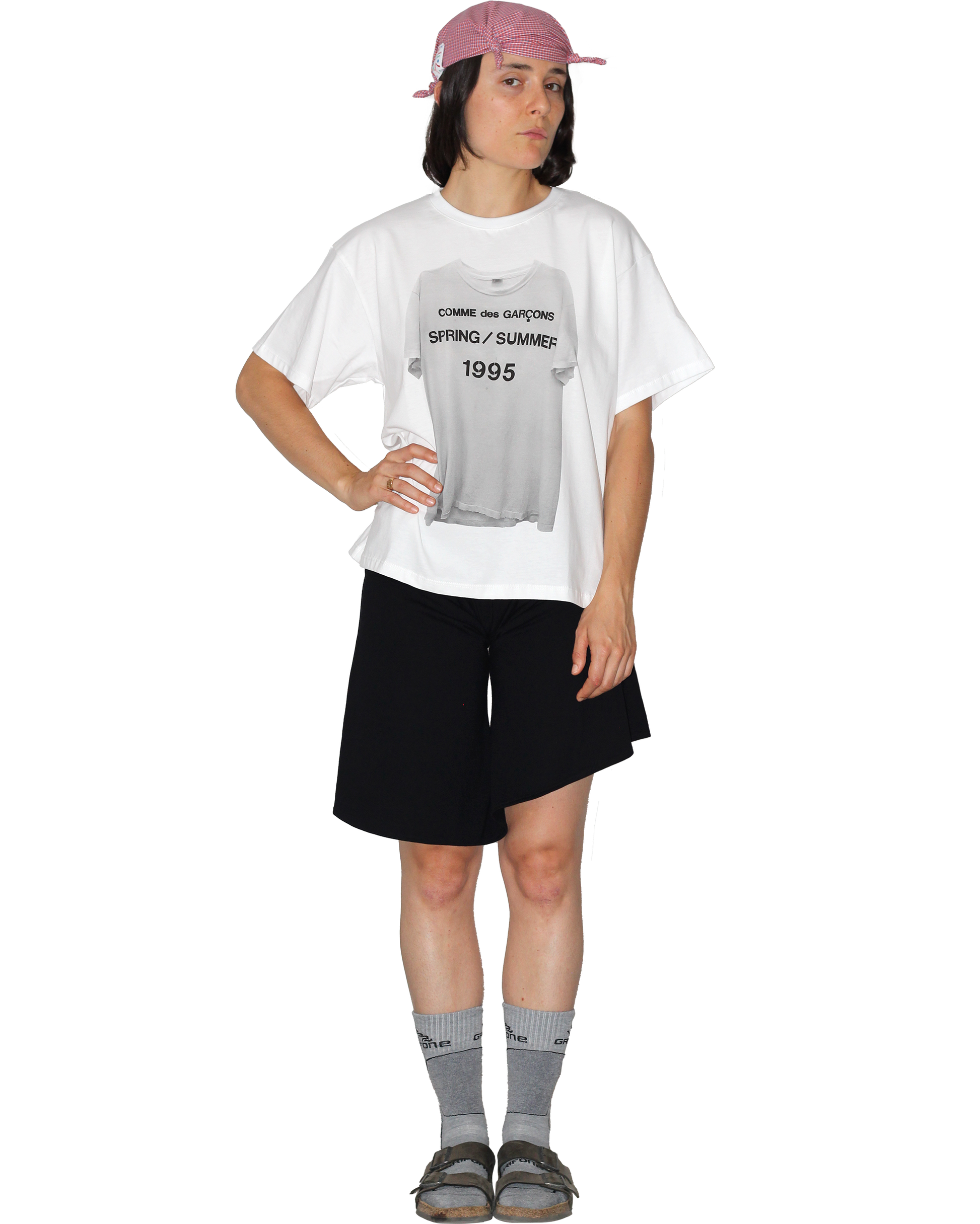 This T-shirt first appeared publicly in 2012 during 95 (In Paris, the outsiders are officially in), a group exhibition in Melbourne, Australia. The show brought together works by Marc Hundley, his twin brother Ian Hundley, and artist Nick Relph, all woven together by a single, curious theme: Comme des Garçons.